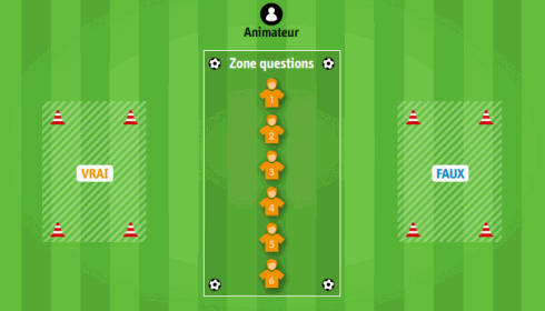 L'éducateur posait une question à l'ensemble des joueurs. Les enfants devaient donc choisir si la réponse était VRAI ou FAUSSE en se dirigeant en conduite de balle vers la zone correspondante. Les points étaient attribués individuellement à chaque participant.